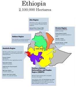 ከመሬት ነጠቃው ጋር በተያያዘ በኦሮሚያ ክልል ለጅቡቲ መንግስት 3 ሺህ ሄክታር ለጥራጥሬ ምርት፣ የህንድ ኩባንያዎች ለሆኑት ለኢማሚ ባዮቴክ 100 ሺህ ሄክታር ለጃትሮፋና ለምግብ ዘይት ዘር፣ ለአልሚደሃ ኩባንያ 28 ሺህ ሄክታር ለሸንኮራ አገዳ፣ ለሮምቶን አግሪ ኩባንያ 10 ሺህ ሄክታር ለቲማቲም ምርት በሚል መሬቱ በሊዝ ተቸብችቧል። በደቡብ ክልል ከ2001 ዓ.ም. ጀምር 200ሺህ ሄክታር የሚያካልል 16 የኢንቨስትመንት ስምምነት ተደርጓል። እያንዳንዱ ኢንቨስትመንት ከ5 ሺህ ሄክታር በላይ ሲሆን ሁሉም የተሰጠው ለውጭ ባለሃብቶች ነው። በአፋር ክልል 409,678 ሄክታር መሬት በማዕከላዊ መንግስቱ መሬት ባንክ አማካኝነት ለባለሃብቶች ተመድቧል። በአማራ ክልል በተለያዩ የዜና ማሰራጫዎች እንደተዘገበው ከ175 ሺህ ሄክታር መሬት በላይ ለውጪ ባለሃብቶች ኢንቨስትመንት ተመድቧል (በአጠቃላይ የመረጃ ምንጭ፡ “the Oakland Institute’’)